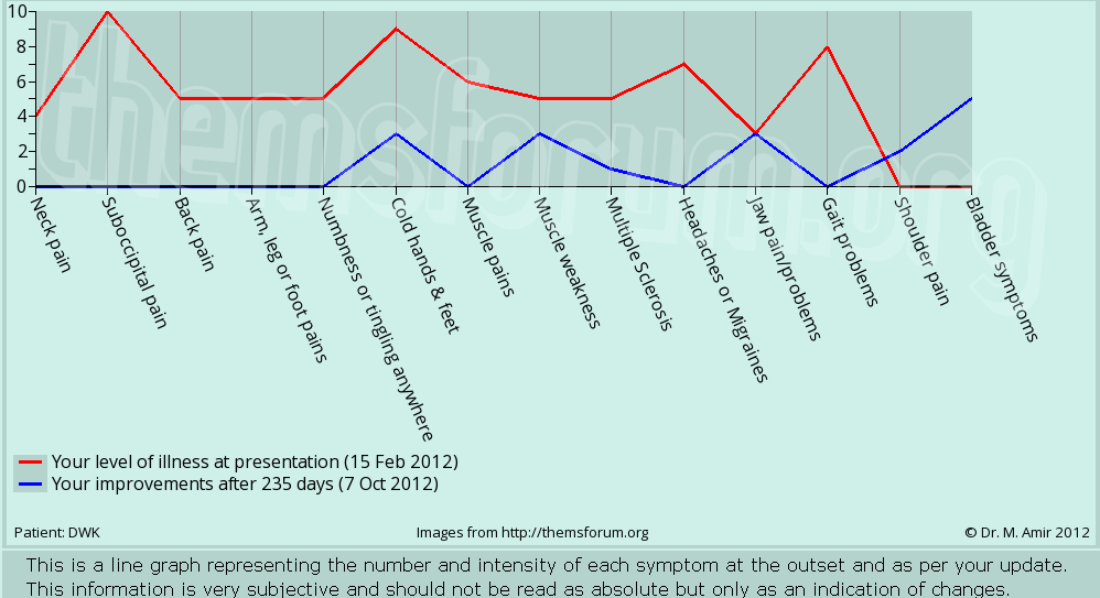 By a stroke of good fortune my Internet searches came upon a very interesting article from the London Evening Standard published in 2009 describing the work being carried out by Dr Amir in Putney, London who has had great success treating MS patients through correction of their jaw and Atlas vertebra alignment. The article gave an email contact for Dr Amir so I thought what have I to lose? So sent a brief email outlining my symptoms and to my surprise he answered (around midnight the same night!). This lead on to more communication including an extensive questionnaire which went right back to the start of my medical history, something I felt very reassured by as no one else I have dealt with regarding my condition has been so thorough.