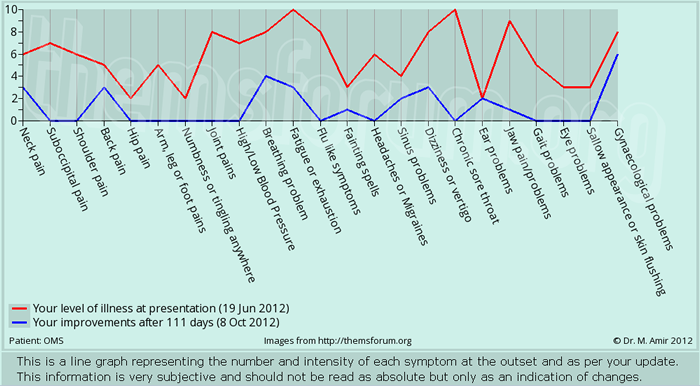 My walking which was crippling me, is getting better- not progressively worse. I have even managed to walk completely unaided for the first time in 10 years! I sleep better, and my body thermostat seems to be working properly again, normal perspiration. Could it be that my disability was actually caused by a problem with my asymmetries and had nothing to do with MS? Was I misdiagnosed? I have been paying a heavy price having lost my youth to this dreaded incapacity and utter lack of hope and dreading the future as I continued to decline prior to this intervention.